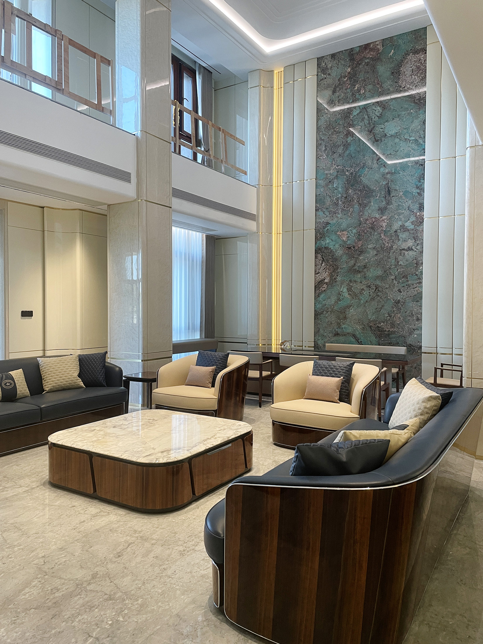 6.1米的挑高下,進(jìn)口翡翠綠大理石巨型背景墻佇立其中