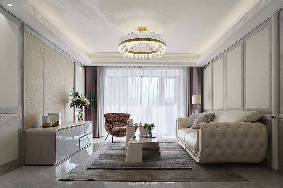 客廳的設(shè)計(jì)非常溫馨雅致,以一組白色皮革拉扣沙發(fā)占據(jù)了視覺中心,旁邊搭配造高低錯落的皮革壓紋組合茶幾,