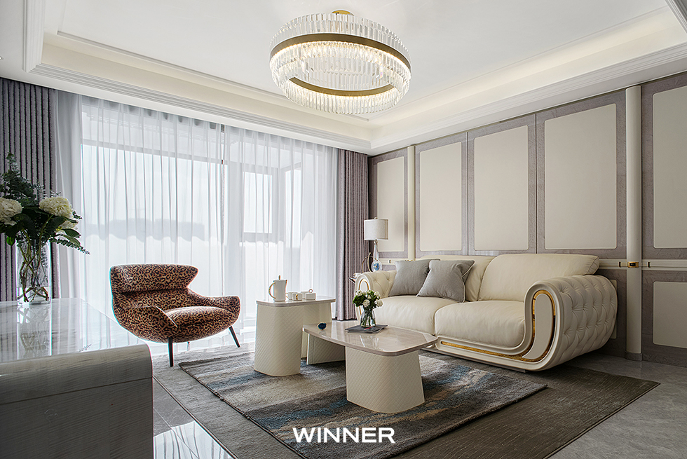 WINNER電視柜面飾天然影木高亮光,與茶幾飾面呼應(yīng),同時與護(hù)墻板的天然木皮形成了一種微妙的呼應(yīng)關(guān)系,大大提升空間格調(diào)。